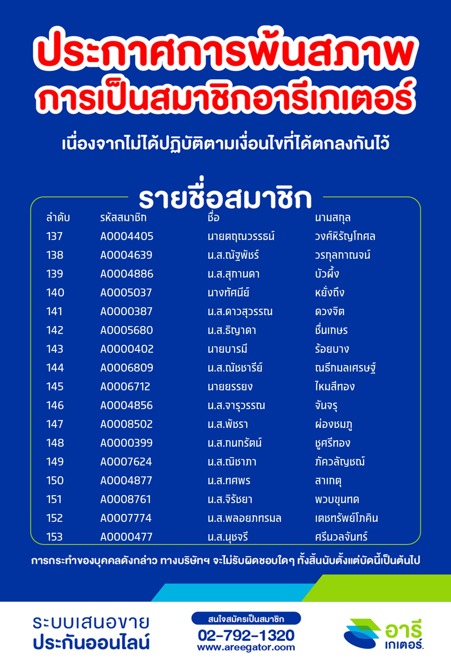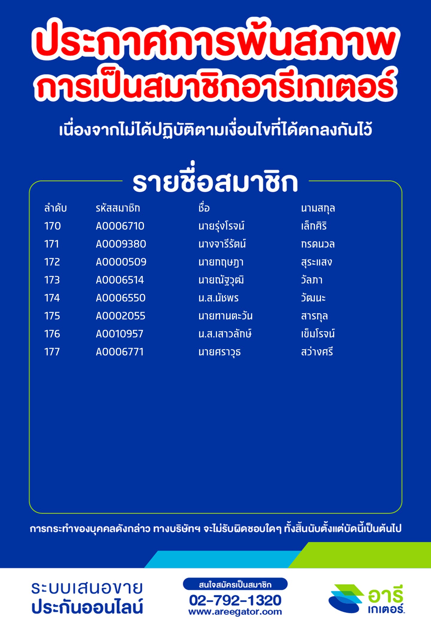 ประกาศการพ้นสภาพการเป็นสมาชิกอารีเกเตอร์ ครั้งที่ 28 (asof ธ.ค.68)