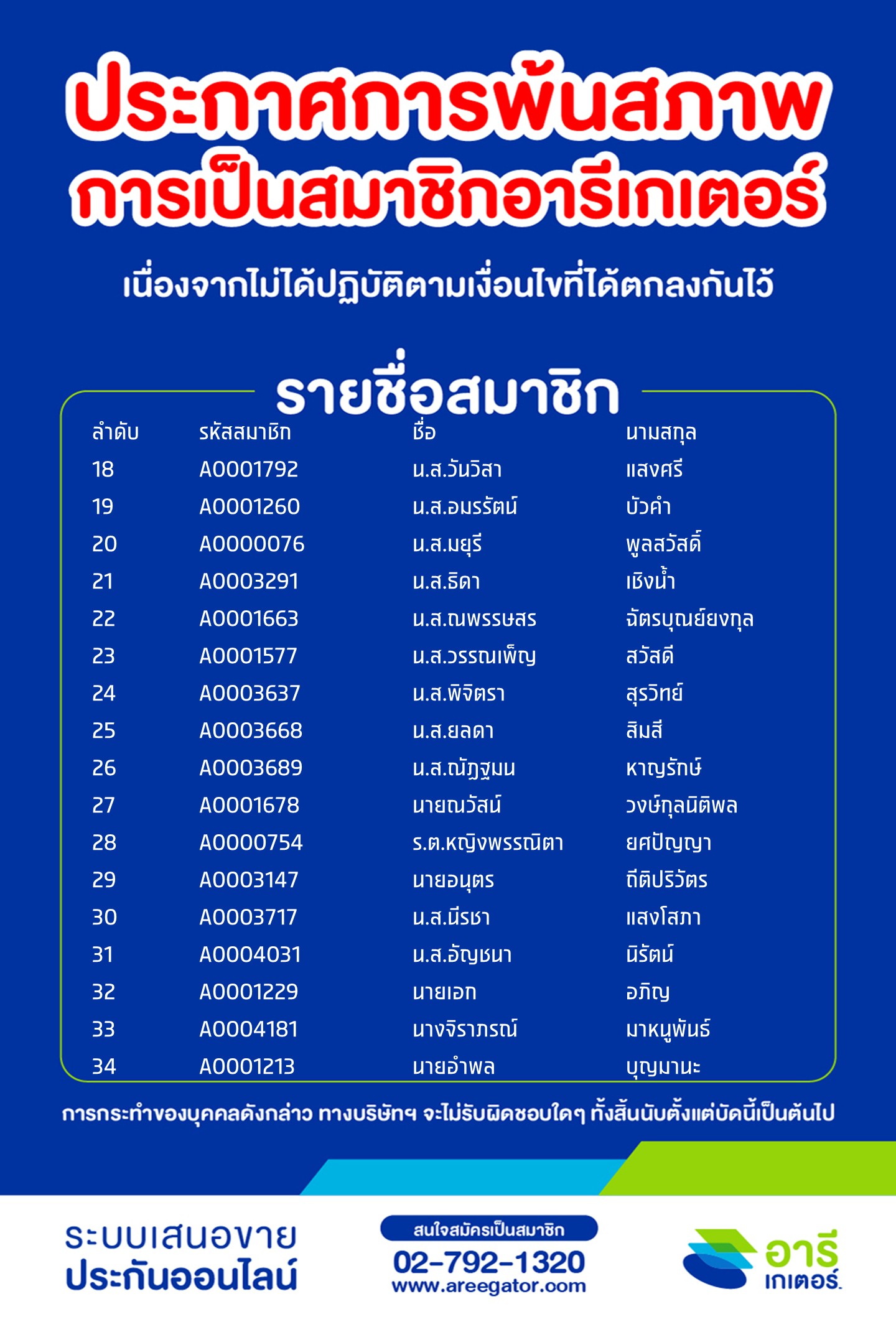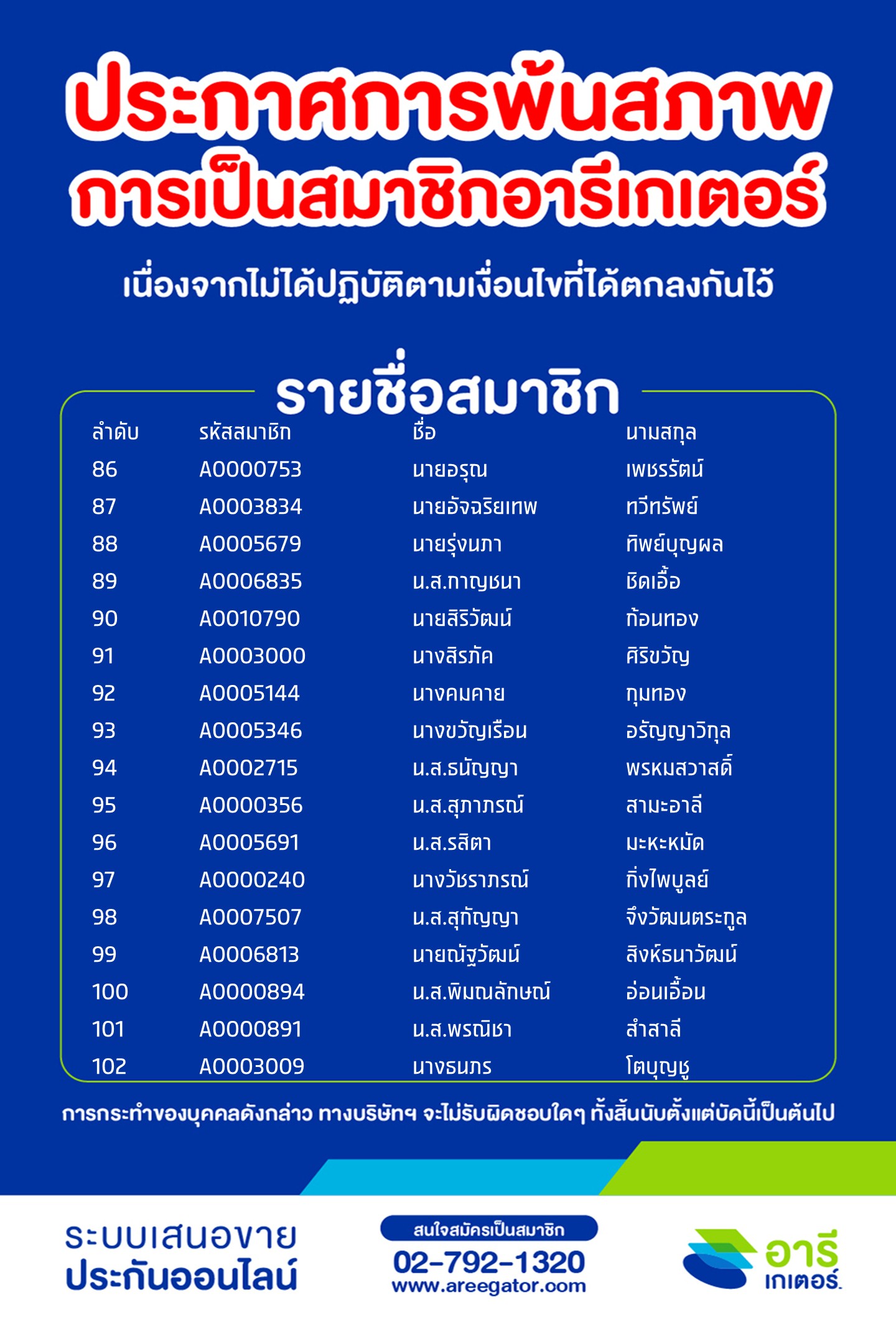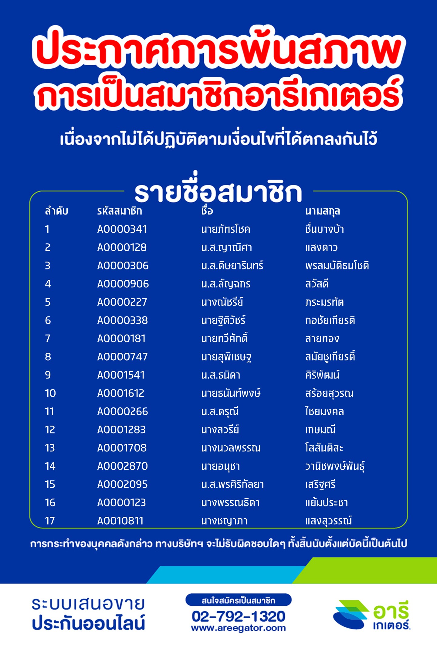 ประกาศการพ้นสภาพการเป็นสมาชิกอารีเกเตอร์ (สะสม) ครั้งที่ 30 (asof ก.พ. 2569)