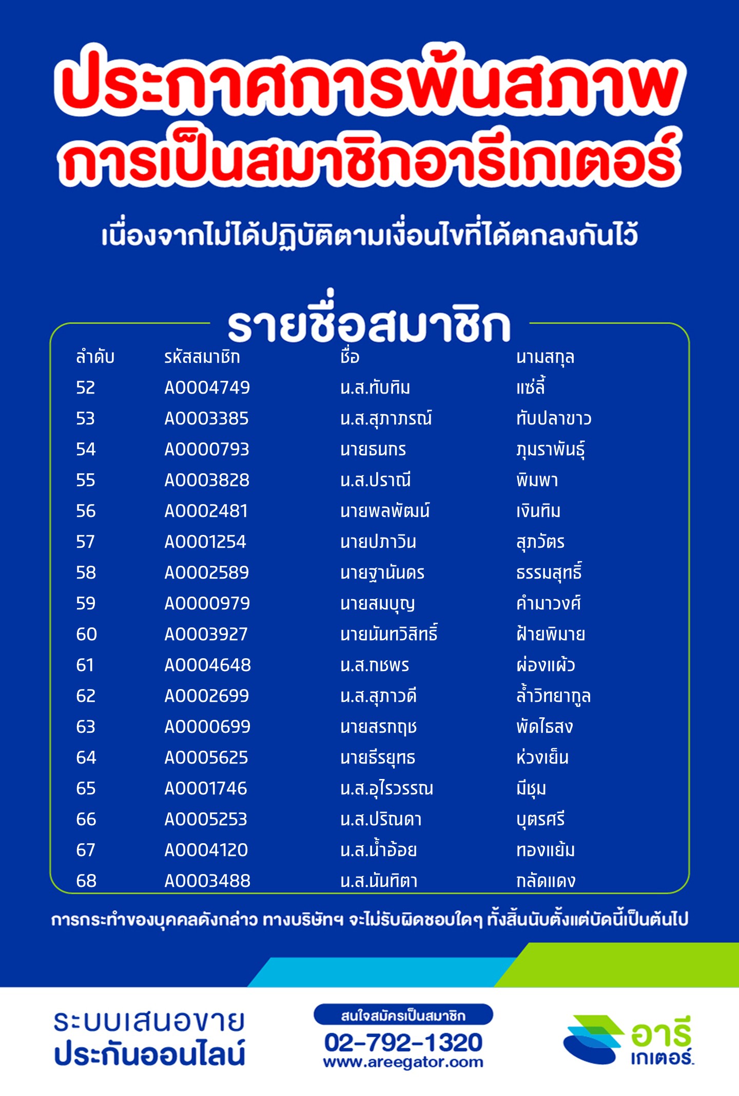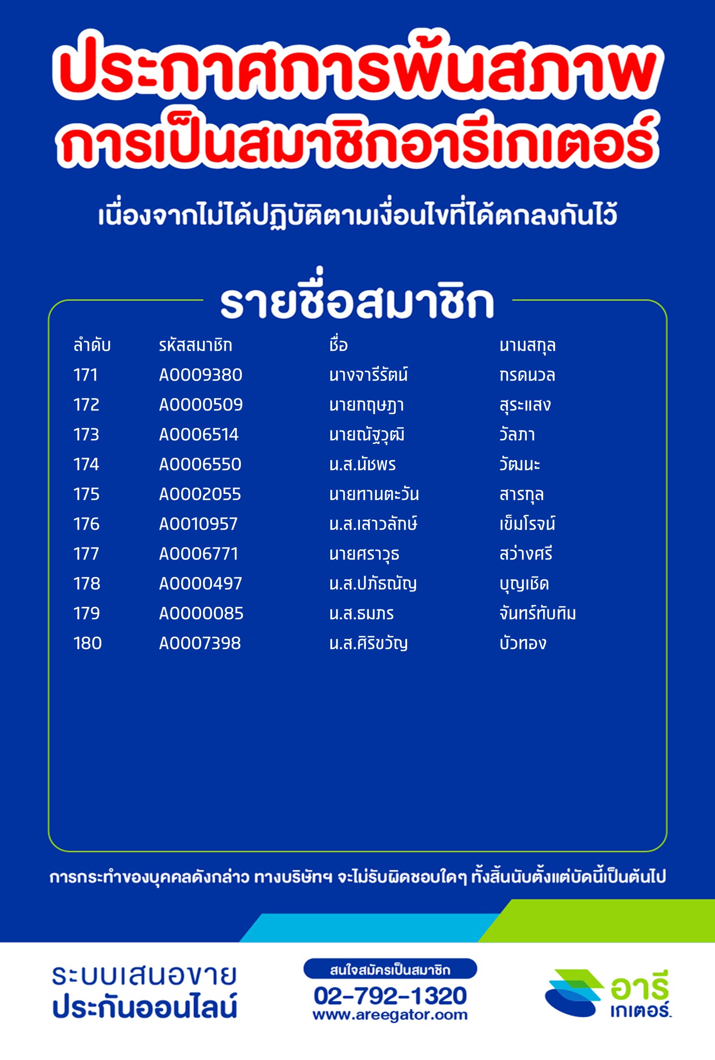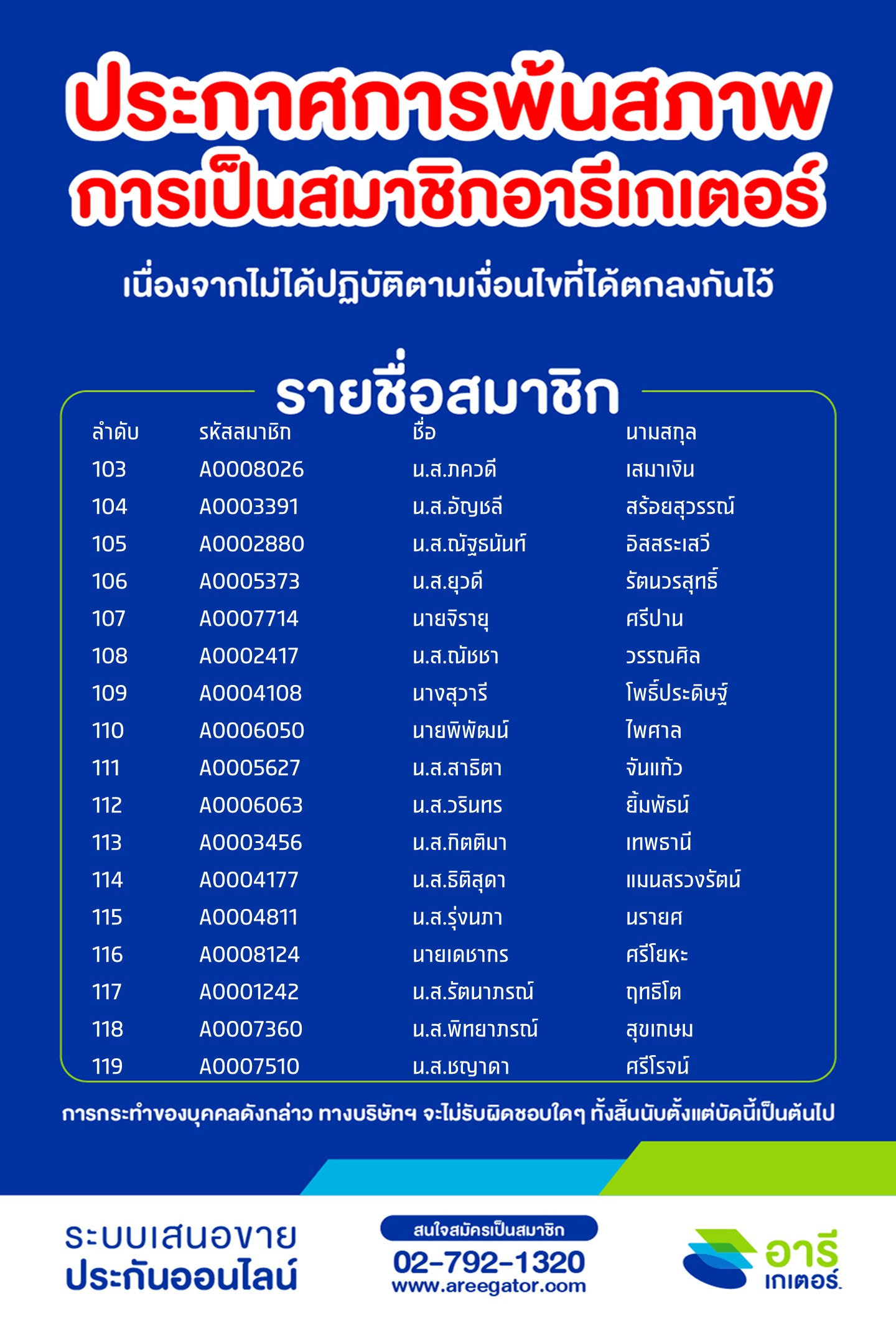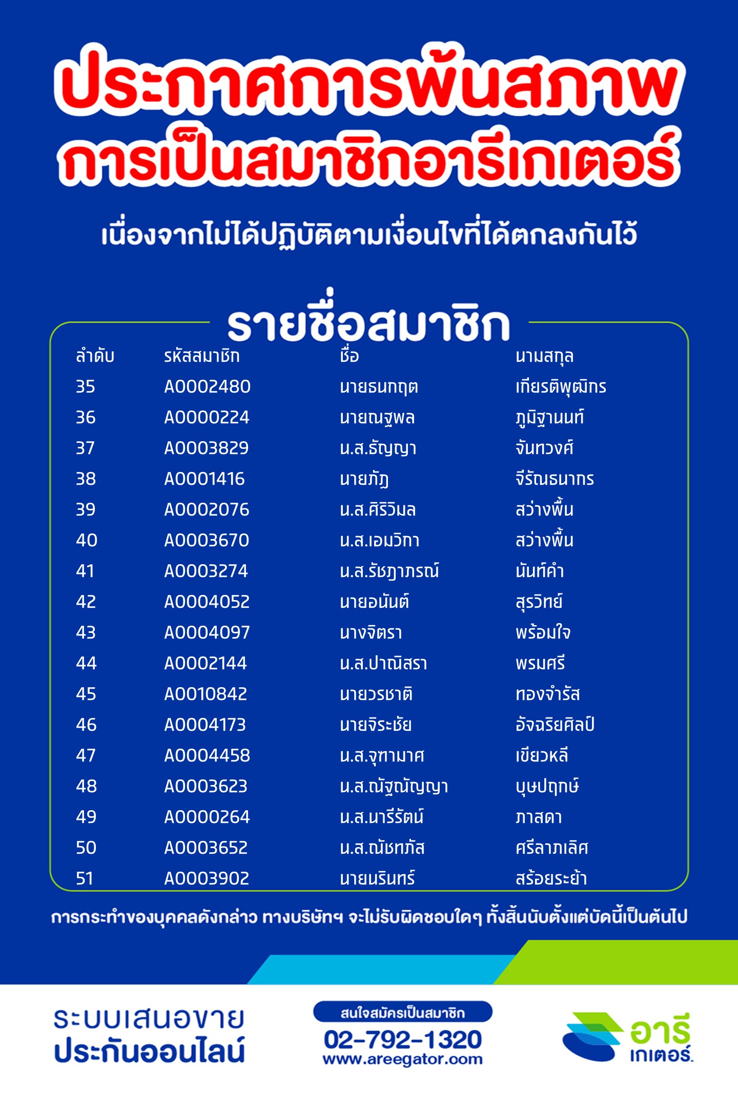 ประกาศการพ้นสภาพการเป็นสมาชิกอารีเกเตอร์ (สะสม) ครั้งที่ 30 (asof ก.พ. 2569)